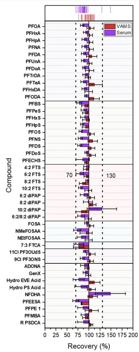 Laboratory control samples (LCS) were aqueous solutions containing 4% bovine serum albumin that were spiked with isotopically labeled PFAS analogues and native PFAS. An LCS and a method blank (MB) sample were run every 20 samples. Recoveries ranged from 76% to 112% for the VAMS-collected samples, with an average recovery of 99% across all analytes (Figure 4). Recoveries for the serum samples, however, ranged from 69.7% to 148.3%, with an average recovery of 88.3%. These results suggest that a VAMS-based approach might improve the efficiency of the extraction of PFAS compared to the serum-based approach.