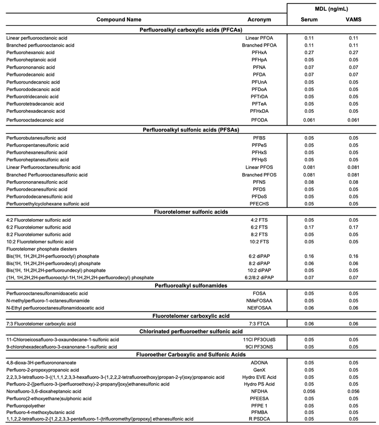 Table 1. Method detection limits (MDL) for PFAS in serum and VAMS samples.
