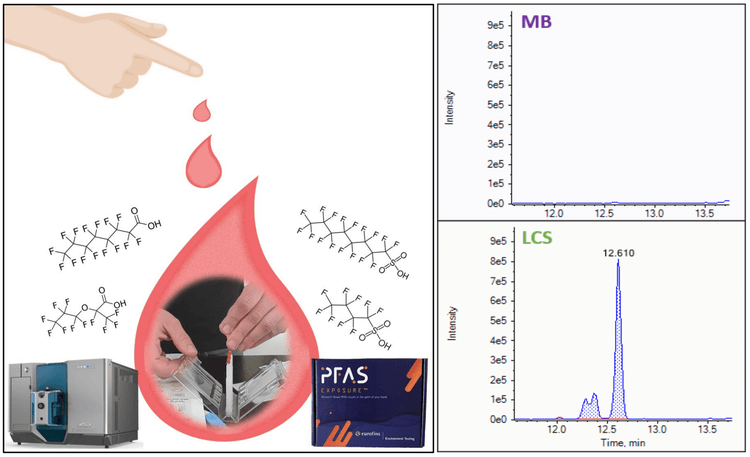 Traditionally, human serum or plasma has been used to measure human exposure to PFAS. However, the process of collecting and analyzing these samples requires a phlebotomist to draw blood, a dedicated laboratory to separate serum or plasma from whole blood and the transportation of samples on dry ice with proper biohazard protocols.4−7 An alternative approach using dried blood spots (DBS) has been employed for several years to address these logistical challenges. However, there is a potential loss in accuracy associated with DBS due to the variability of blood volume on the filter paper and punch size.4−7