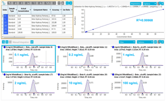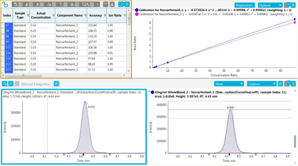 A processing method for the 29 analytes and 5 internal standards was used to review the time-scheduled MRM data in SCIEX OS™ Software. Utilizing the MQ4 algorithm in Analytics, detection and integration of the peaks from the background was easily accomplished. The MQ4 algorithm provided selection of the correct peak within the viewing window, especially in the case of the isomers where more than one peak were present. This ease of use helped in analyzing replicate injections (n=3) which were used to verify the consistency of ion ratios and to confirm the accuracy of concentration values within ± 20%, as shown in Figure 3 and 4.