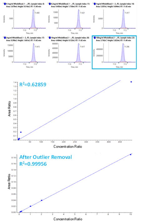 Sample preparation: A calibration curve was prepared in methanol and spiked into human whole blood to give desired concentrations ranging from 0.1 ng/ml to 100 ng/ml in order to evaluate the dynamic range.