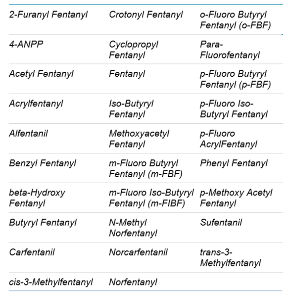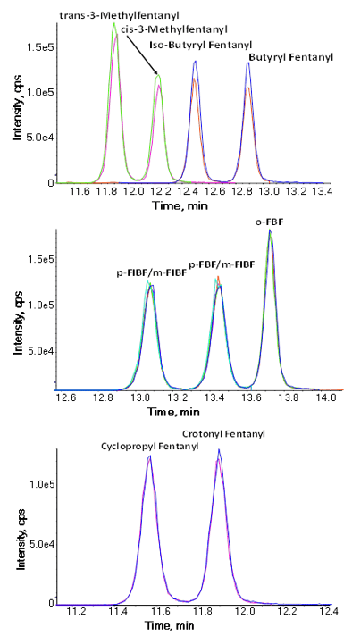 Nine fentanyl analogues (trans-3-MethylFentanyl, cis-3-Methylfentanyl, Iso-Butyryl Fentanyl, Butyryl Fentanyl, p-FIBF/m-FIBF, p-FBF/m-FBF, o-FBF, Cyclopropyl Fentanyl, Crotonyl Fentanyl) were isomeric with other analogues on panel and thus have no unique fragments that could be used for detection. Therefore, chromatographic separation of these analogues from their isomers is critical for confident identification and quantitation and therefore was the focus of this study (Figure 2).