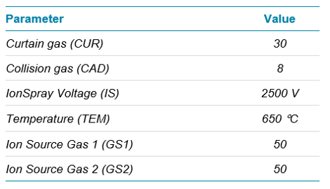 Source parameters are provided in Table 1. The compound-dependent voltages of Declustering Potential (DP), Collision Energy (CE) and Collision Cell Exit Potential (CXP) were optimized for each transition and can be found in the supplementary information.1