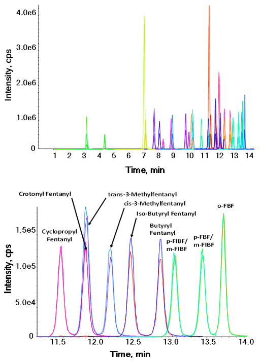 - Fentanyl panel consisted of 29 analytes and 5 internal standards, with a total of 58 MRM transitions.