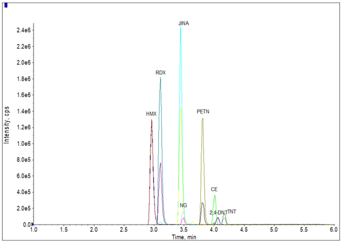 Mass spectrometry: A SCIEX Triple Quad 3500 LC-MS/MS System with Turbo V™ Source and Electrospray Ionization (ESI) was used. The 8 organic explosives were detected in negative ion mode using two MRM tansitions per compound to allow quantification and confirmation of the explosive compounds.