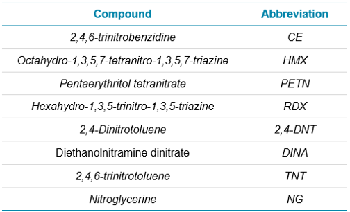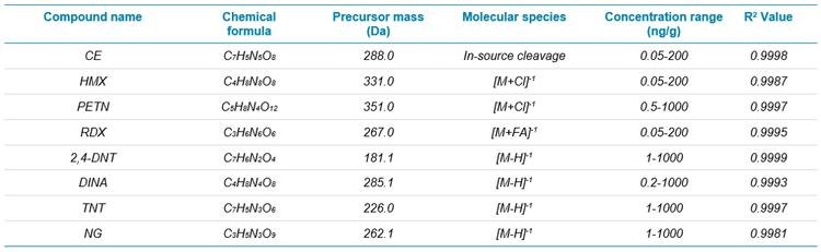 - Excellent accuracy and linearity for concentrations ranging between 0.05 and 1000 ng/g, with R2 values above 0.99 for all 8 explosive compounds used in this study