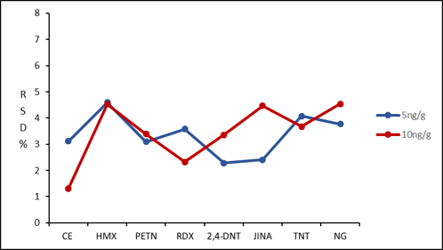 - Reproducibility of injection (measured as RSD) across two contration levels (5 ng/g and 10 ng/g) was found to be between 1.31 and 4.59% for all the explosive compounds