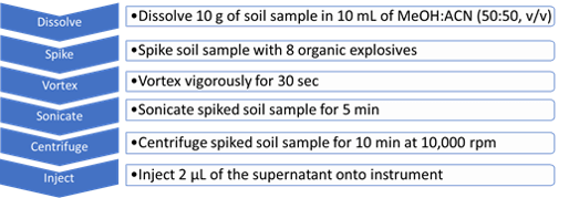 Sample preparation: 10 g of surface soil samples were dissolved in 10 mL of methanol:acetonitrile (50:50, v/v), spiked at various concentration levels with a standard mixture containing the 8 organic explosives, vigorously vortexed for 30 seconds, sonicated for 5 minutes and centrifuged at 10,000 rpm for 10 minutes. 2 µL of the supernatant was injected for analysis. Table 1 lists the 8 organic explosives used in this study. The sample preparation procedure is summarized in Figure 2.