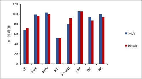 - Explosive compound extraction recovery values were found to be between 51.7 and 106%