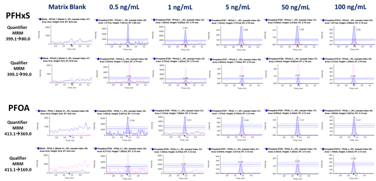 The ability to accurately detect low levels of PFAS extracted from serum samples is critical to inform the extent of their accumulation in the human body. The series of calibrators was injected to evaluate the ability to quantify PFAS across a wide range of concentrations. Figure 6 shows representative extracted ion chromatograms (XIC) for the two MRM transitions monitored for PFHxS and PFOA, two PFAS commonly measured in the exposed population. Five levels of calibrators were used to determine the ion ratio criteria for the quantifier and qualifier ions of PFHxS and PFOA. The series of XIC traces for the two compounds showed a high level of consistency and precision, as evidenced by the acceptance criteria (20% or less) of all the ion ratios across the calibration series ranging from 0.5 (LLOQ) to 100 ng/mL. However, the majority of the PFAS showed detectable signal below the LLOQ. Figure 1 shows the XICs for PFHxS for the matrix blank (left), at 0.1 ng/mL (middle) and 0.5 ng/mL (right). The signal at 0.1 ng/mL is the limit of detection (LOD) for PFHxS as it is well above the blank signal. Similar peaks were observed below the LLOQ for the PFAS in the panel. In addition, the assay showed great reproducibility over the course of the two consecutive days the data were acquired (inter-day peak area variations of 5% or less were observed for the 22 PFAS across the calibration range).