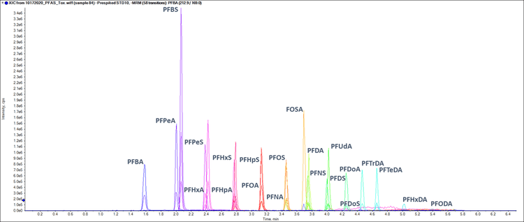 Figure 4. Chromatographic profile of the 22 PFAS monitored in this study.  Extracted ion chromatograms (XICs) resulting from the optimized data acquisition method using a 10 ng/mL neat standard mixture. The combination of the optimized mobile phase composition and column choice enabled baseline separation of the PFAS congeners. This method has also shown the ability to separate branched and linear isomers of individual PFAS chain lengths (not shown here).7