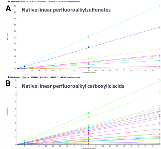 Figure 5. Excellent linearity for the 22 PFAS. Regression curves resulting from the calibration series from 0.5 to 100 ng/mL for A) native linear perfluoroalkylsulfonates and B) native linear perfluoroalkyl carboxylic acid extracted from serum samples. R2 values greater than 0.99 were observed for all of the PFAS in the panel.