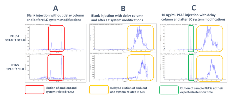 PFAS are pervasive and persistent compounds that have the potential to accumulate and contaminate the LC systems used in analytical testing. As a result, measures were implemented to reduce the risk of outside, ambient and system-related PFAS contamination. The most critical measure was the inclusion of a delay column between the autosampler and LC pumps to trap ambient and system-related PFAS and ensure they will be retained away from the sample signals.