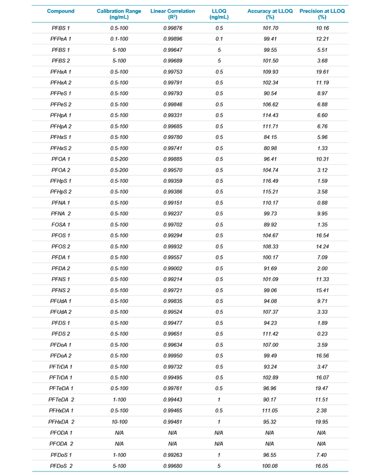 The lower limit of quantification (LLOQ) for each of the PFAS included in the panel was determined based on the lowest concentration at which the integrated peak area of the analyte was quantifiable, with calculated concentration accuracy between 80 and 120%, precision (%bias) below 20%, ion ratio acceptance criteria of less than 20% and maintaining a linear calibration curve with an R2 value of at least 0.99.