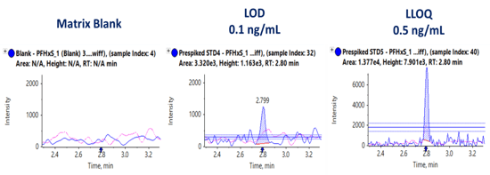 Figure 1: Accurate and sensitive detection of PFAS extracted from serum samples. Representative extracted ion chromatograms (XICs) of the qualifier ion for PFHxS, one of the most persistent PFAS measured at the highest levels in exposed human population. From left to right: in matrix blank, at 0.1 ng/mL (LOD) and 0.5 ng/mL (LLOQ).