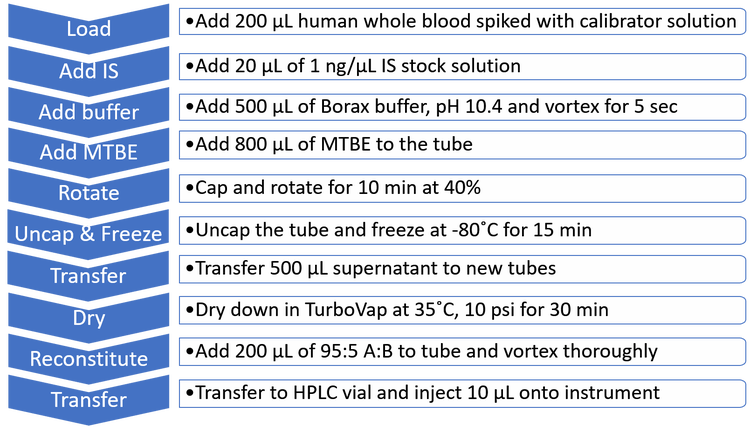 Sample preparation: NSO were extracted from the 200 µL spiked whole blood mixtures using a liquid-liquid extraction (LLE) procedure summarized in Figure 2.