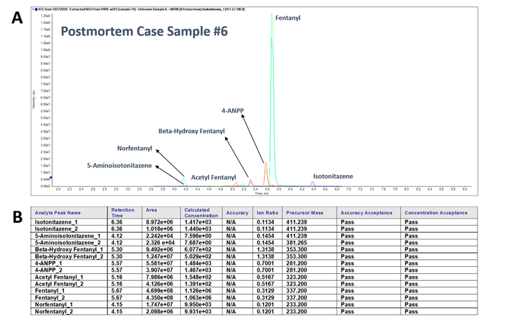 Figure 6 shows the results of the successful detection of one NSO and its metabolite: isotonitazene and 5-aminoisotonitazene, as well as fentanyl and four of its analogs/metabolites: beta-hydroxy-fentanyl, norfentanyl, 4-ANPP and acetyl fentanyl. These results are from postmortem case sample #6 at concentrations of 1434.33, 7.93, 599.10, 9756.67, 147.69 and 1465.00 pg/mL, respectively. The displayed XIC in Figure 6A shows the seven analytes positively identified in the postmortem sample. The results summary table shown in Figure 6B lists the analyte peak name, retention time, area and calculated concentration of each of the positively identified analytes. It also shows ion ratio, precursor mass, and the accuracy and concentration acceptance criteria.