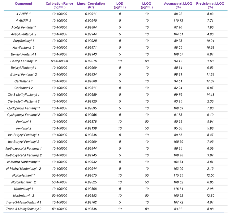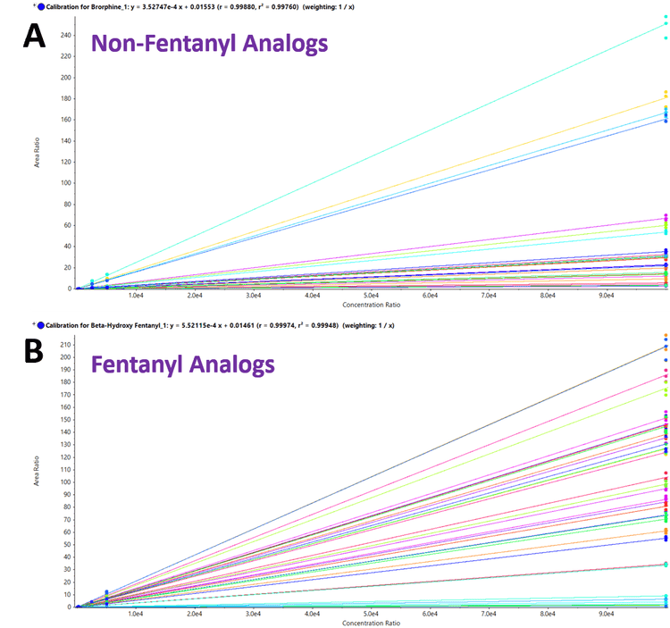 Figure 5 shows the resulting calibration curves for the fentanyl analogs (A) and non-fentanyl analogs (B) in the panel. Excellent linearity was observed across the concentration ranges analyzed with R2 values greater than 0.99 for all of the NPS in the panel.