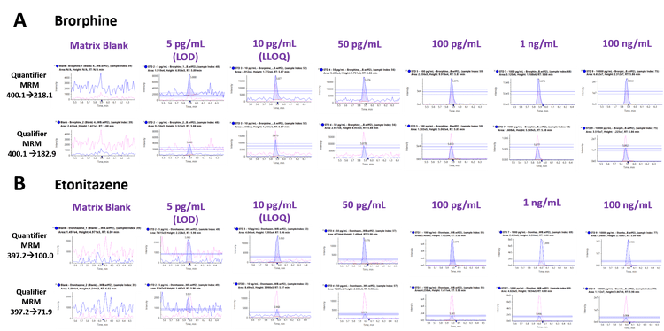 The ability to accurately detect trace levels of NPS extracted from human whole blood is critical for a toxicologist’s interpretation of drug testing results and their help in determining the cause of death. The series of calibrator solutions were injected to evaluate the quantification performance of the system and its ability to accurately measure low levels of drugs and their metabolites with a high level of precision and accuracy. Figure 4 shows representative extracted ion chromatograms (XICs) for the two MRM transitions monitored for A) brorphine and B) etonitazene, two highly potent NSO that have been linked to accidental drug overdoses at low concentration. The series of XIC display overlays both the quantifier and qualifier ions for a blank injection and for concentrations ranging from 5 pg/mL (LOD) to 100 ng/mL. Also displayed in Figure 4 is the tolerance in the form of the ion ratio line overlay which helps visualize the confidence levels. The signal shown for 5 pg/mL is well above the blank signal. The signal for 10 pg/mL is the lower limit of quantification (LLOQ). The LLOQ is the lowest concentration level meeting the following standard performance requirements: signal-to-noise ratio (S/N) > 10, calculated concentration accuracy (%bias) within 20%, precision less than 20%, ion ratio acceptance criteria below 20% and calibrators falling on a linear regression curve with an R2 value of at least 0.99. Overall, the developed method provided robust and accurate quantification of the drugs in the panel without any sacrifice or compromise in data quality.