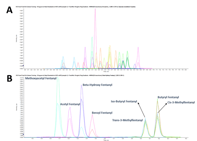 A diluted, 10 ng/mL neat standard mixture containing the 32 NSO was used for initial method development. Figure 3A shows the chromatographic profile of the NSO panel resulting from the optimized data acquisition method. Baseline separation of the 32 analytes, including fentanyl and non-fentanyl isomeric species, was accomplished by using a combination of appropriate gradient, adequate mobile phase composition and ideal column choice (Phenomenex Kinetex C18). Together, this enabled better retention of the more polar NSO throughout the course of the 15.5 minute long gradient.
