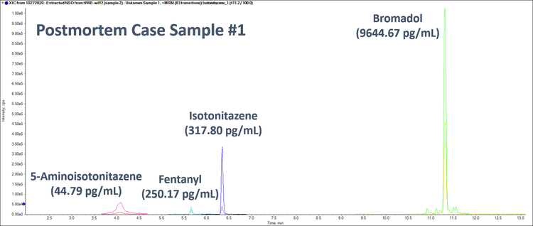 The potency of some non-fentanyl analog NSO showcased in this workflow is a true testament of their ability to cause fatal outcomes. Figure 1 shows the detection of four analytes that were detected in postmortem case sample #1 which was analyzed using the described method. The XIC shows the successful detection of fentanyl at 250.17 pg/mL and two NSOs: isotonitazene (317.80 pg/mL) and its metabolite 5-aminoisotonitazene (44.79 pg/mL), and bromadol, (9644.67 pg/mL). The presence of fentanyl alone at 250 pg/mL might not be sufficient to explain the overdose. However, the two potent non-fentanyl analog NSOs, isotonitazene and bromadol, can contribute to additive opioid effects leading to a combined drug overdose scenario.