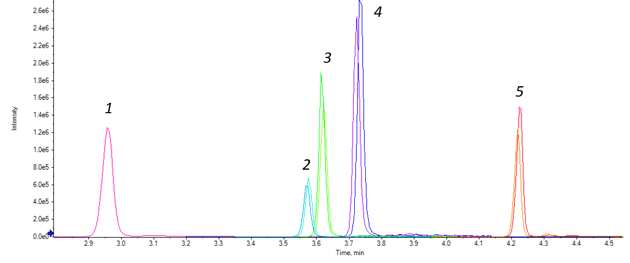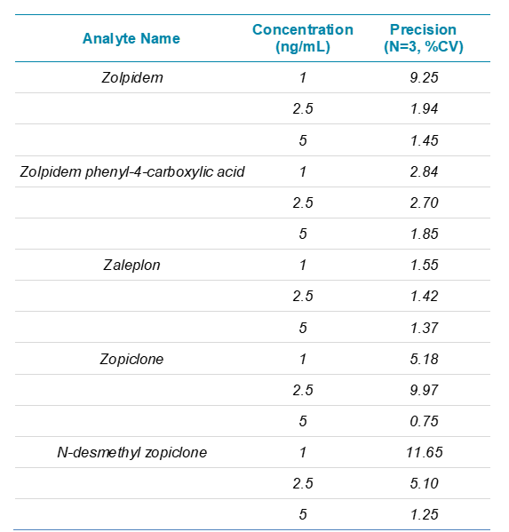 Figure 2 shows the extracted ion chromatogram (XIC) for the 5 Z drugs and 4 corresponding internal standards. Separation of the analytes was accomplished using a 5 minute LC runtime, which was sufficient to achieve near baseline separation of all the Z drugs in the panel.