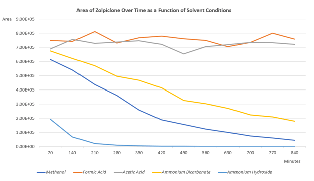 The degradation profile of zopiclone was investigated under various conditions over time and characterized using both the SCIEX 5500+ System and the SCIEX X500B QTOF System. Zopiclone spiked in synthetic urine was subjected to five different solvent conditions over the course of 840 minutes in a chilled HPLC autosampler kept at 8 ºC. Figure 4 shows the degradation profile of zopiclone over time under 5 various conditions. The traces shown on the plot represent the peak area of zopiclone as a function of exposure time. Degradation of zopiclone is observed under neutral and weakly basic conditions (10% methanol, 10% methanol with 0.1% ammonium bicarbonate, pH 7.5 and 10% methanol with 0.1% ammonium hydroxide), as evidenced by the peak area decrease. However, zopiclone appears to be stable under acidic conditions (10% methanol with 0.1% formic acid and 10% methanol with 0.1% acetic acid). These results suggest that the rapid degradation of zopiclone can be alleviated with addition of acid.