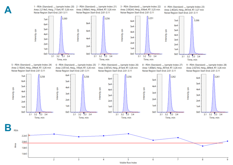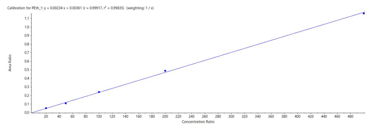 Figure 1 shows extracted ion chromatograms (XICs) of PEth at each of the 5 concentrations tested in the calibration range (20 to 500 ng/mL). A calibration curve was generated to determine the linearity of the assay across the calibration range. Figure 3 shows the resulting regression line for PEth from 20 to 500 ng/mL, which shows that the assay demonstrated excellent linearity with an R2 value of 0.998.