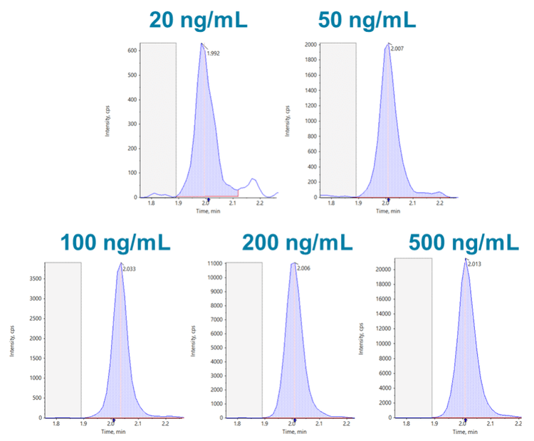 - Accuracy and precision were maintained across the calibration range tested (20 to 500 ng/mL)