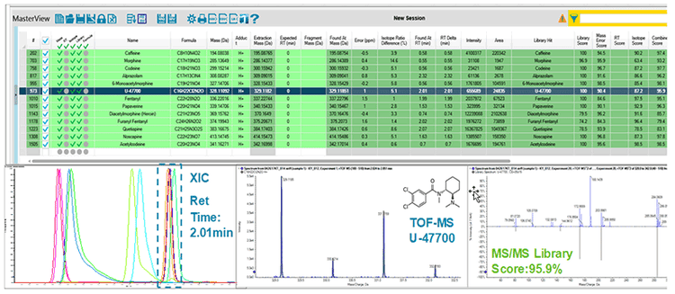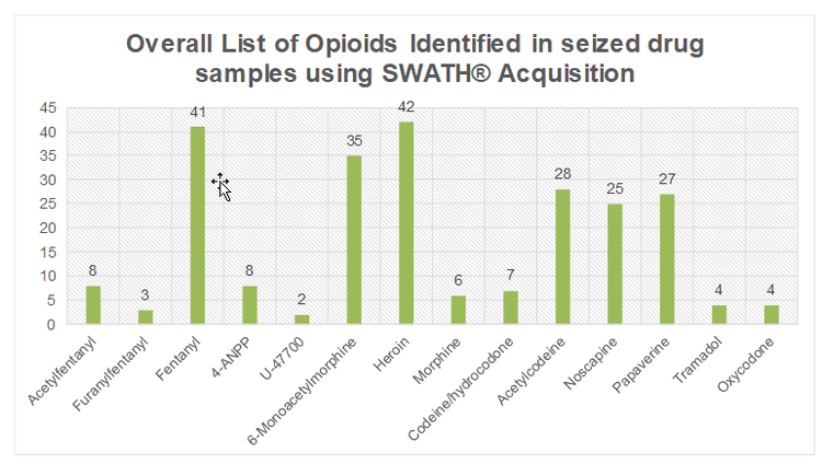 A chart displaying an overall list of the different opioids found in this comprehensive study is also detailed in Figure 5. Other analytes missed by GC-MS but positively identified by SWATH Acquisition included novel stimulants and other psychoactive substances.