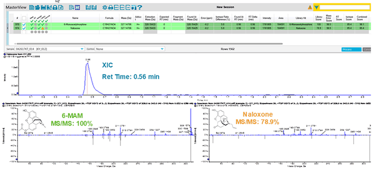 Figure 4 shows the XIC of a seized drug sample indicating the presence of an illicit compound at 0.56 min. The MS/MS spectrum at that retention time generated two potential candidates for positive identification: 6-monoacetylmorphine (6-MAM) and naloxone. These two analytes are isobaric species with high incidences of presence in seized drug powders and toxicological casework samples.