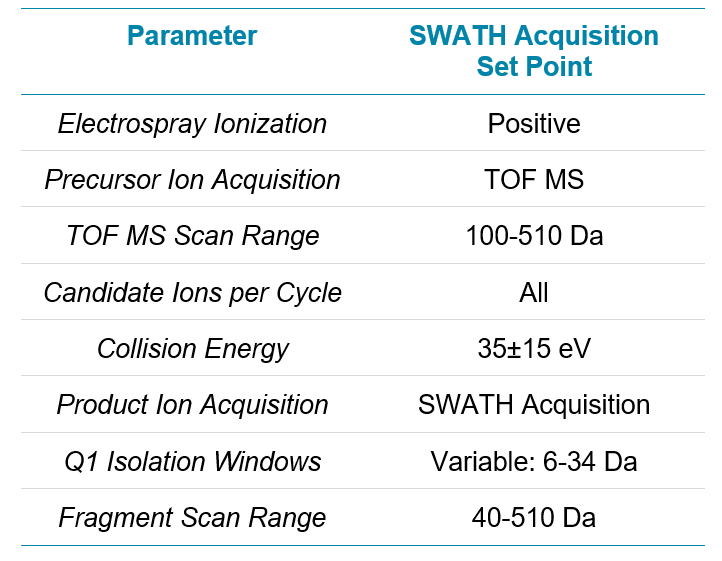 Mass spectrometry: MS and MS/MS data were collected using SWATH Acquisition on the SCIEX TripleTOF 5600+ System with Analyst® TF Software 1.6, each SWATH Acquisition scan beginning with a TOF MS experiment. Acquisition parameters are detailed in Table 1.