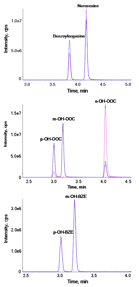 Optimal chromatographic separation was accomplished by using a Phenomenex Kinetex Biphenyl, 100x3mm, 2.6 µL C18 column which allowed for better retention and selectivity of the more polar analytes throughout the gradient. The column was held at 30˚C during the course of the experiment. The column in conjunction with an optimized mobile phase composition produced the separation that was needed to correctly distinguish all isomers. This chromatographic separation was optimized for this MRM assay but can also be used on the SCIEX X500R QTOF System, for additional screening or confirmation techniques. Figure 3 shows the separation of three sets of isomeric metabolites of cocaine.