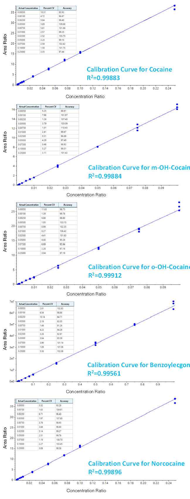Following the SPE procedure, 10 µL of the reconstituted solution were injected for each compound. Calibration curves were generated for each of the compounds to determine limits of quantitation (LOQ). The results demonstrated excellent linearity of the generated regression curves covering linear dynamic range from 3 to 4 orders of magnitude; coefficients of variations (Cs) within 10% and good accuracies. Signal-to-noise ratios (S/N) at LLOQ were found to vary from 10 to 50. Table 2 summarized the lower limits of quantitation (LLOQ) for cocaine and metabolites panel. Figure 5 shows a few representative calibrations curves and statistics of quantitation generated using this comprehensive method.