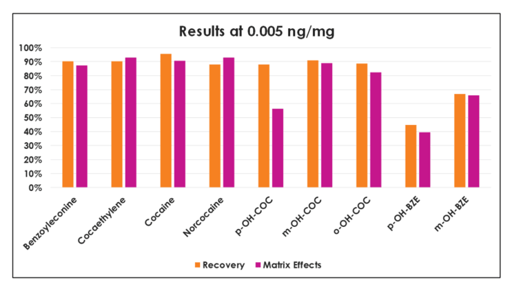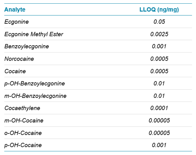 - Analyte extraction recoveries were demonstrated to be greater than 80% enabling the analytical workflow to obtain sub pg/mg lower limits of quantification (LLOQ) in hair matrix for the two hydroxycocaine isomers.