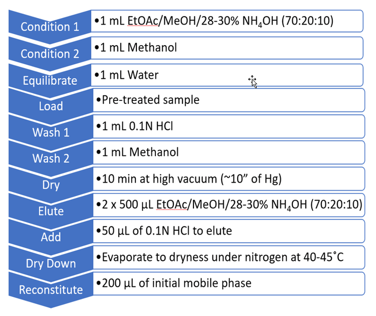 Hair sample preparation and digestion: Hair samples were washed according to accepted laboratory procedure, dried and cut into segments of ~ 2 mm lengths. Approximately 20 mg of each hair sample was transferred into a suitable and sealable container with cap and 1 mL of 0.1 N HCl was added into each container. The containers were incubated overnight at 45ºC for complete digestion of the hair samples. The next day, the containers were removed from the incubator and allowed to cool down to room temperature. 10 µL of each internal standard (IS) were added to the 800 µL of hair extract solution and the containers were thoroughly mixed. The resulting solutions underwent solid phase extraction using the Phenomenex Strata®-X-C, 30 mg/3mL (Part No. 8B-S029-TBJ) according to the procedures shown in Figure 2.