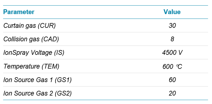 The source parameters are provided in Table 1. The compound-dependent voltages of Declustering Potential (DP), Entrance Potential (EP), Collision Energy (CE) and Collision Cell Exit Potential (CXP) were optimized for each transition and are represented in Table 3.
