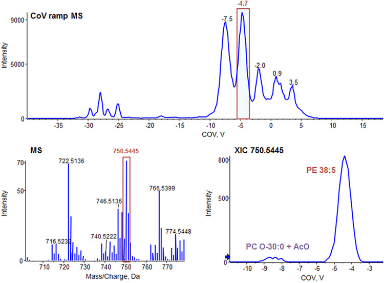 Using SelexION Technology on a TripleTOF® 5600 System, a lung lipid extract was infused and the DMS CoV was ramped from -40 to 20V in the negative ion mode (isopropanol used as DMS modifier). All PE species are found in the CoV peak at -4.7 minutes and the accurate mass TOF MS data underlying this peak can be viewed. An XIC of the 750.5446 m/z peak reveals two peaks in the corresponding ionogram. The large peak is PE 38: 5 and has a COV of -4.4 whilst the smaller is a PC either-linked 30:0 with a COV of -8.5.