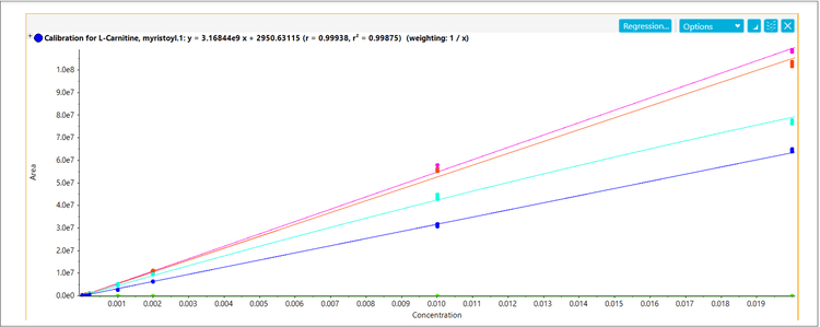 The detection and quantification of acylcarnitine compounds can be challenging since many species occur as isomers and are found at very low concentrations in biological samples. Here, several acylcarnitine compounds were quantified in matrix, using diluted standards and the SCIEX 7500 system. Linearity, lower limits of quantification (LLOQ) and dynamic range were characterized and the sensitivity and reproducibility of the SCIEX 7500 system were evaluated. These experiments were performed without derivatization and with minimal sample preparation to quantify these low-level analytes in a biological matrix.