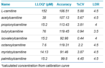 To assess reproducibility and robustness, 3 replicates of carnitine and acylcarnitines at their respective LLOQ concentrations in matrix were analyzed. A summary of the accuracy and %CV results is shown in Table 3. The reproducibility observed at the LLOQ was <6% across all the analytes, indicating strong reproducibility. The LDR observed for some analytes was 4.5 orders.
