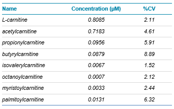 Next, the endogenous levels of carnitine and acylcarnitines in 10 µL of extracted Wistar rat plasma were assessed. In brief, this plasma was diluted 1:20 utilizing a simple sample preparation, without derivatization or SPE extraction was employed, and 1 µL of plasma was injected on the column. Table 4 illustrates the sensitivity of the SCIEX 7500 system using this minimal extraction protocol. The concentrations of each acylcarnitine compound range from low µM to high nM and provide excellent reproducibility in a biological matrix.