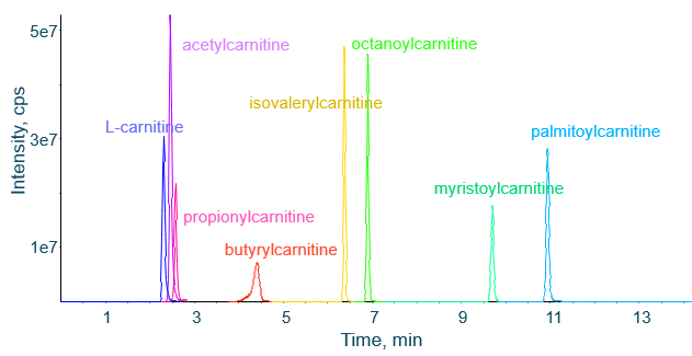 Figure 1 shows extracted ion chromatograms for 8 unlabeled acylcarnitine compounds in diluted 1:50 neat solution. Compounds ranging in size from L-carnitine toand short-chain acetylcarnitine, to medium-chain octanoylcarnitine, to long-chain palmitoylcarnitine in neat solution at the 1:50 dilution, to highlight the optimized separation.