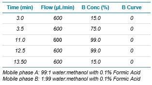 Chromatography: An ExionLC system with a Phenomenex Kinetex column (C18, 2.6 µm, 150x4.6 mm; p/n 00F-4462-E0) was used to perform the separation. The total run time was 15.5 min. A 1.0 µL injection was used. Table 1 shows the chromatographic gradient used.