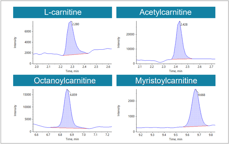 In many laboratories across the world, acylcarnitines and related molecules from a variety of sample types are quantified to investigate metabolic conditions, such as organic acidemias and fatty acid oxidation defects.2 They have also been investigated as potential biomarkers for Type 2 Diabetes and other related conditions.3 Whole blood from dried blood spots (DBS) is most commonly analyzed during screening, however, plasma, serum and urine are other common matrices used for analysis.