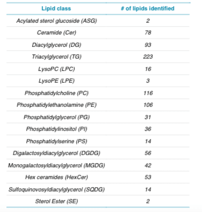 The untargeted plant lipidomics workflow was successfully developed using SWATH acquisition on the SCIEX TripleTOF 6600 system, MS-DIAL for data processing, followed by MetaboAnalyst software for statistical analysis. The total number of annotated lipids species, which were based on accurate mass, fragmentation pattern and retention time, was 779 lipids, from 16 lipid classes found in only from positive mode data.