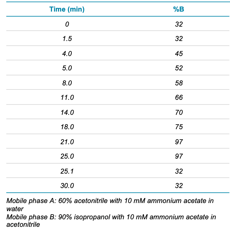 LC-MS/MS analysis: The lipid extracts were placed in the autosampler set to 12 °C then 8 µL of each was injected onto a Phenomenex Kinetex C18 Column (2.6 µm, 100 Å, 100 x 2.1 mm) set to 55°C. Separation was performed using the SCIEX ExionLC system. Elution was performed using the gradient and solvents described in Table 1.