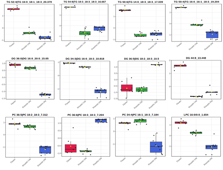 Using this workflow, 779 molecular lipid species were characterized out of 3642 spectral matches confirmed by MS/MS and 6263 unknown features detected in the two plant tissues. The aligned data for all 12310 features with m/z and retention time showed a clear differentiation of different aged rosettes and flowers as visualized in principal component analysis (PCA) and heat map (Figure 1).