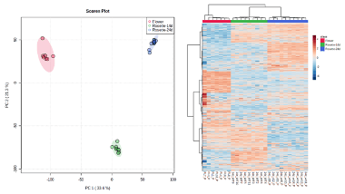 Results from the one-way ANOVA and post-hoc tests with an adjustable p-value (FDR) of 0.05 showed that 259 features were identified as significantly different between the three different sample types. The untargeted lipid profiles of three tissue samples created using SWATH acquisition and MS-DIAL data processing reveals developmental lipid changes in the different aged rosettes and tissue-type specific differences between flower and rosette tissues. According to the heatmap analysis of the lipid profiles, the two sets of rosette tissue samples (14-day and 24-day-old) show a more similar lipid profile when compared to the profile of flowers (Figure 1, right). The PCA clearly shows significant differences between the lipid profile of the tissues (Figure 1, left).
