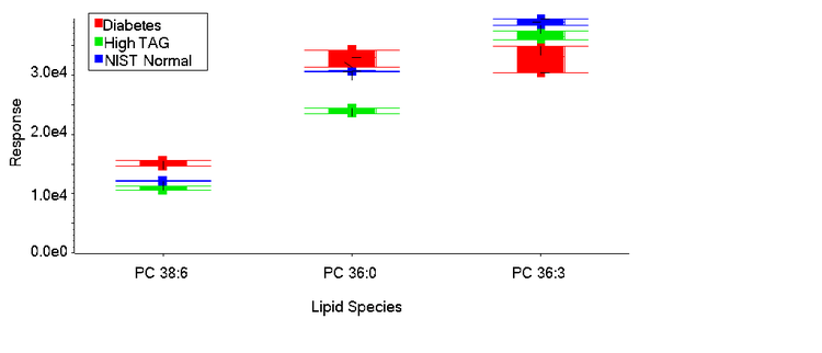 To further investigate the changes in lipid species, data was exported from LipidView software to MarkerView software for statistical analysis. Figure 5 displays 3 different PC species that are significantly changing between the groups. Even though it is the brutto level of these lipid species that is under investigation, noticeable changes between the groups in overall carbon length and degree of desaturation can be observed. This high-throughput analysis allows quick investigation these changes to then guide biological research and gain further insight in the lipid composition of these possible markers.