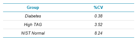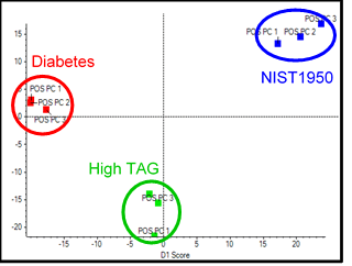 To demonstrate the effectiveness of this workflow, three types of NIST plasma were extracted and infused to evaluate changes in the 5 classes described above. Figure 1 shows the supervised PCA analysis, highlighting the PC1 vs. PC2 loadings plot from MarkerView software and illustrating both the reproducibility of the method and the ability to capture the differences between each plasma type. Table 2 provides the percent CV values for each of these groups.